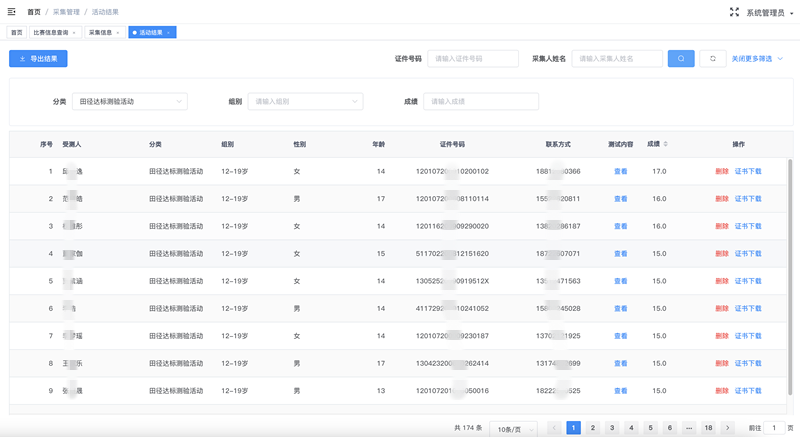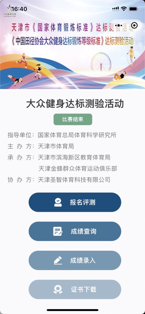 依托聖智體育研發(fā)的賽事(shì)管理系統(以下簡稱“系統”),活動主辦方實現了對(duì)賽事(shì)報名、規則發(fā)布、賽事(shì)編排、成(chéng)績判定、排名、電子證書發(fā)布、數據可視化呈現等環節智能(néng)化管理;受測者通過(guò)掃描活動小程序二維碼實現了線上注冊、報名、成(chéng)績查詢、證書下載;現場裁判通過(guò)系統實現了測驗成(chéng)績線上錄入。